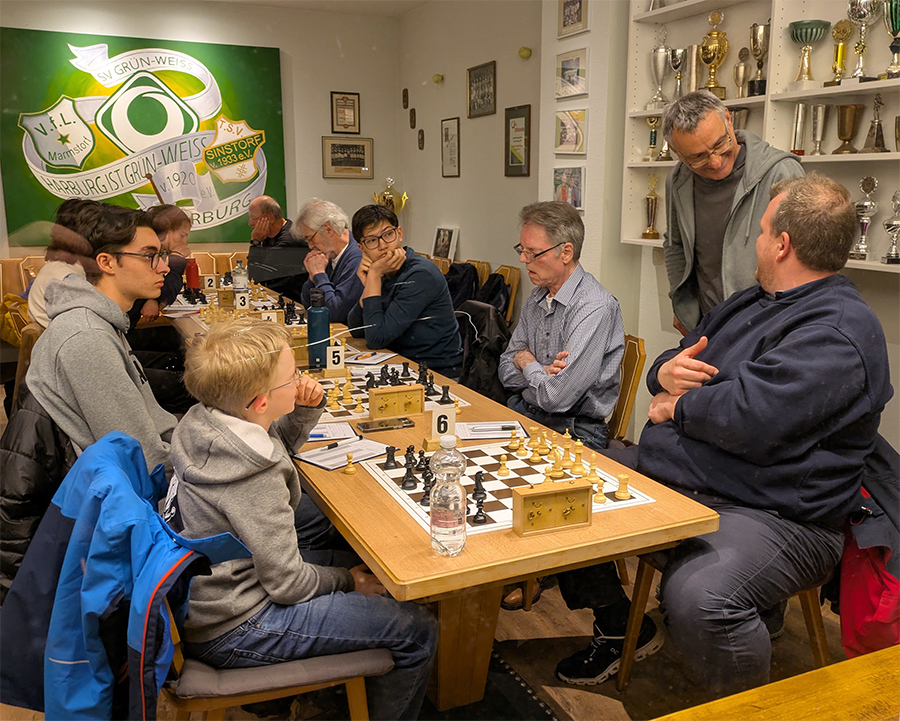 Alle anderen Bretter schienen heute recht schnell „weg zu fliegen“. Michael hatte (schon wieder) frühzeitig einen Bauern weniger, kämpfte noch lange, aber auch hier vergebens, Auch Johannes hatte frühzeitig einen Bauern seinem jungen Gegner überlassen und der junge Mann hatte kein Mitleid mit Johannes. Detlef bekam seine Probleme in der Brettmitte serviert. Dort ging nach einem Abtausch zu viel Material verloren. Ali schlug mit der Dame auf b7 ein und bekam diese dann nicht mehr dort hinaus. Er versuchte es zwar noch mit einer Fesselung, aber irgendwie klappte das alles nicht. Bei Bodo brach der Gegner im Königsflügel ein und machte fette Beute.