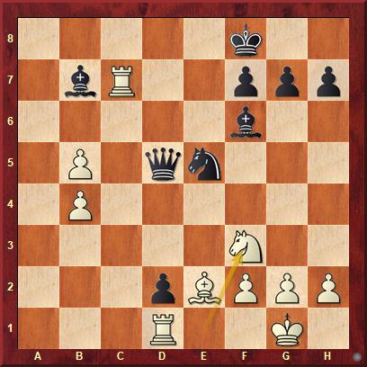 Am einfachsten gewinnt hier 27... Sxf3+, denn nach 28.Lxf3 erobert De5 mit Doppelangriff auf c7 und e1 einen Turm und 28. gxf3 scheitert aus dem gleichen Grund. Alvaro hätte, wie er in der Analyse erzählte, nach Sxf3+ sofort aufgegeben. Matthias wählte stattdessen 27...g5, was zwar den Gewinn noch nicht verdarb, doch in der Folge gelang es dem Gegner in ein Endspiel mit Turm gegen zwei Läufer abzuwickeln, das er aufgrund des schwer aufzuhaltenden b-Bauern sogar noch gewann.