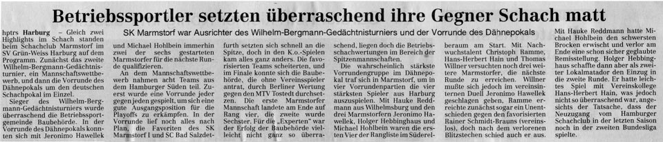 Betriebssportler setzten überraschend ihre Gegner matt vorherige zurück nächste (Quelle: Harburger Rundschau, 28.06.2000) Zum Seitenanfang © SK Marmstorf News - Info - HMM - Archiv - Galerie - Forum - Brokdorf - Links - Events
